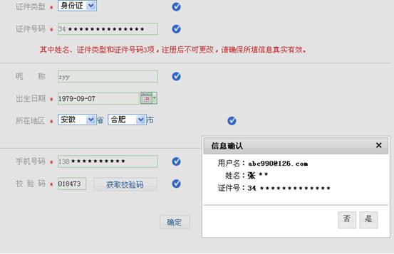 3、注册过程中,系统会要求你填写有效的手机号码,点击“获取校验码”(免费)。将手机收到的“校验码”输入后点击“确定”,系统会提示你核对你注册的用户名、姓名和身份证号,核对无误后点击“是”。如果信息有误,点击“否”,重新进行注册(图4)。请牢记你的用户名(即注册时使用的邮箱名)和密码。