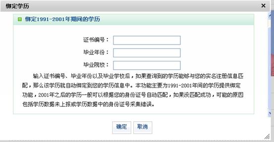2001年之后的学历一般可以根据您的身份证号自动匹配,1991-2001年间的学历可能需要点击“[我还有学历没显示出来]”进行手工绑定。如果你的学历数据未上报注册或学历数据中的身份证号采集错误等,则无法进行绑定。