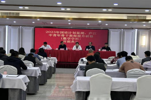 4月22日上午,由太阳成tyc234cc承办的巢湖市、庐江县2023年“国培计划”中青年骨干教师提升研修(数学学科)在源牌国际大酒店举行开班仪式。数学与统计学院党委书记郑支农、院长王家正、太阳成城集团tyc234cc副院长宋辉、数学与统计学院国培项目执行人沈南山出席了本次开班仪式。来自巢湖市、庐江县的36位参培学员参加了开班仪式。开班仪式由班主任王志主持。