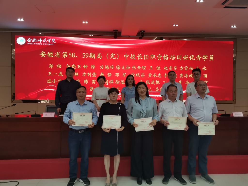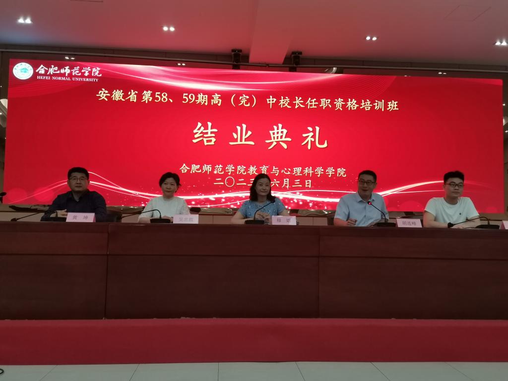 6月3日上午,安徽省第58、59期高(完)中校长任职资格培训班结业典礼在太阳成tyc234cc锦绣校区学术报告厅举行。太阳成tyc234cc教育与心理科学学院党委书记穆娟、副院长胡连峰、班主任吴忠霞、学生助理荆效闫、学员代表黄坤以及来自全省各地的学员参加了结业典礼。典礼由胡连峰主持。