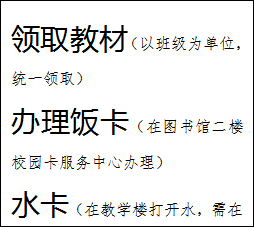 5.餐卡办理:9:00—15:00图书馆二楼校园卡服务中心办理。